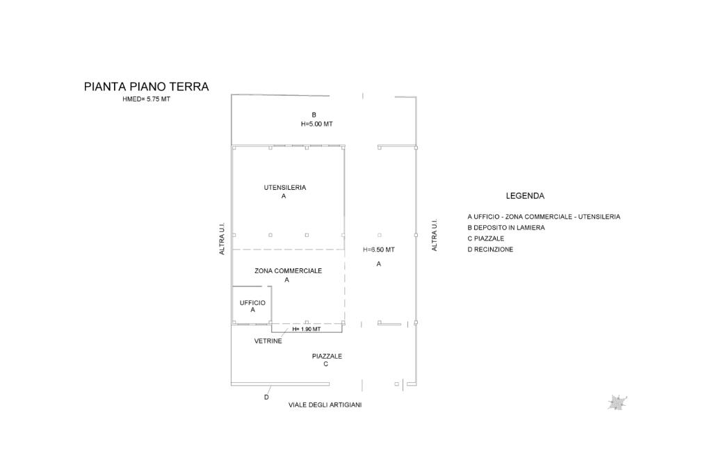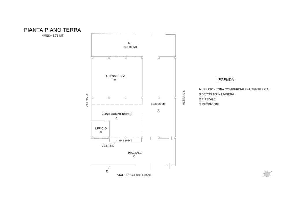 Situato in una zona ad elevato transito veicolare, il capannone è composto da un unico ambiente con un'area riservata ad uffici e un'ulteriore area riservata a servizi igienici. Ha un'altezza massima di circa 6,50 metri, un'altezza sottotrave di 4,85 metri.